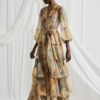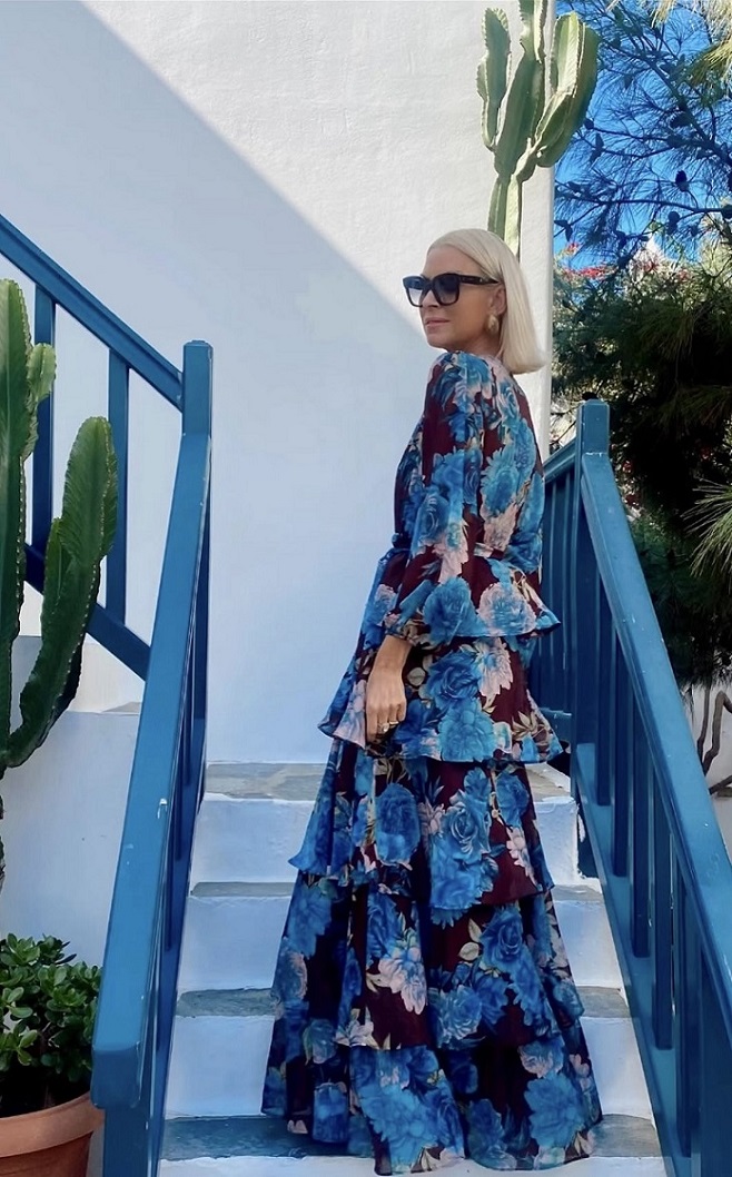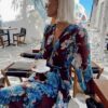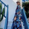 Εντυπωσιακό maxi φόρεμα από ελαφριά μουσελίνα με floral print αποχρώσεις καφέ – μπλέ , ιδανικό για ειδικές περιστάσεις, πάρτι ή βραδινές εμφανίσεις. Διαθέτει ελαστική μέση με ασορτί ζώνη, puff μανίκια με λάστιχο και στρώσεις με βολάν, προσφέροντας θηλυκή και κομψή σιλουέτα.