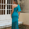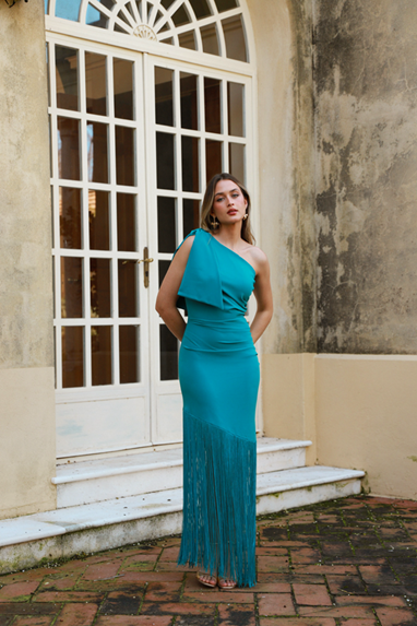 κομψό τιρκουάζ φόρεμα με κρόσια αποπνέει θηλυκότητα, κίνηση και μια διακριτική πολυτέλεια. Το έντονο αλλά δροσερό χρώμα του τιρκουάζ θυμίζει καθαρά νερά και καλοκαιρινή φρεσκάδα, χαρίζοντας φωτεινότητα και ζωντάνια στην εμφάνιση.